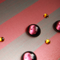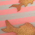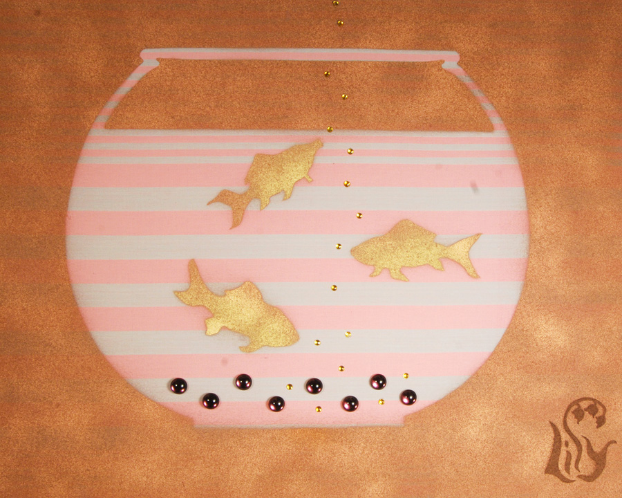 A child’s first pets nibble at vintage glass faceted topaz “fish pellets”. The aquarium gravel is comprised of vintage amethyst Swarovski glass stones, Austrian from the 1950’s, uncirculated old stock. Extremely difficult to photograph, these stones glow with a complex, purplish hue, much lighter than they appear in the photograph.