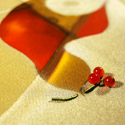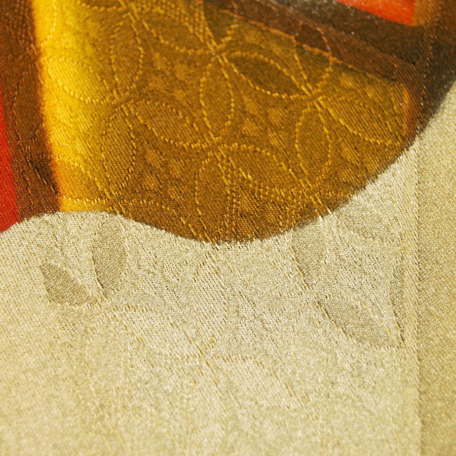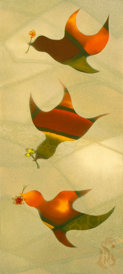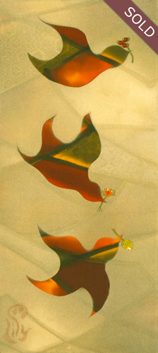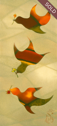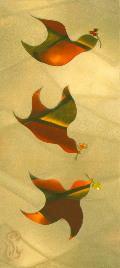 Birds of silk Kimono fabric with a gorgeous stained glass effect gather French wired glass flowers, berries and twigs.