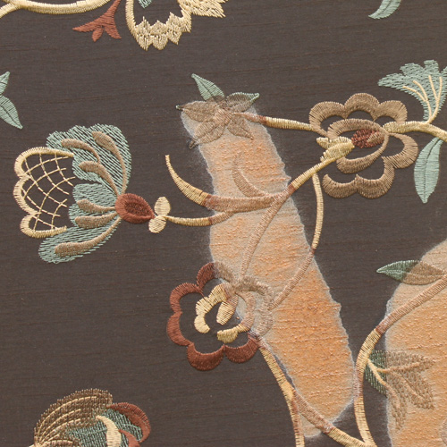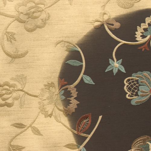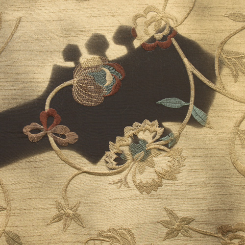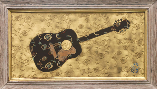Light dances across the gold fabric that provides the setting for this timeless acoustic. The dimensions are 32" x 56", including vintage frame, the perfect size to hang over a couch in your living room.
