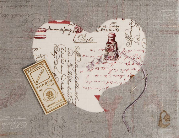 A delicate and lovely heart, as astonishing as it may seem, can be mended with a time worn method. Each subject is part of a limited edition. The colors, fabric pattern, and vintage accents vary with each piece.