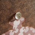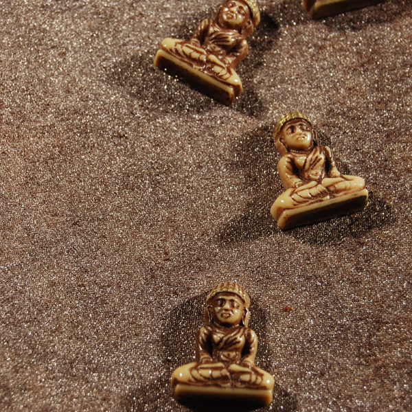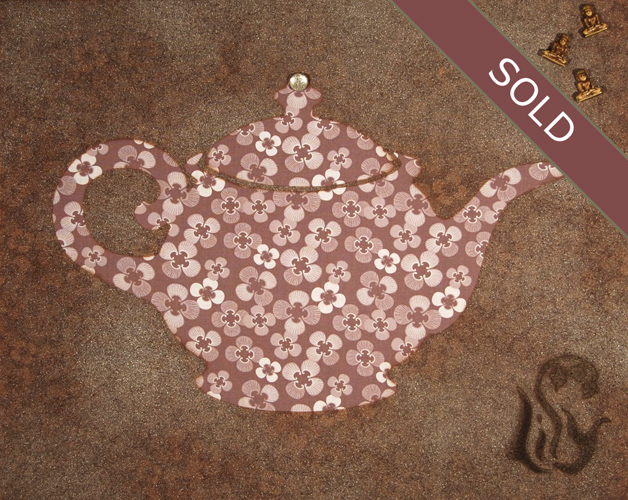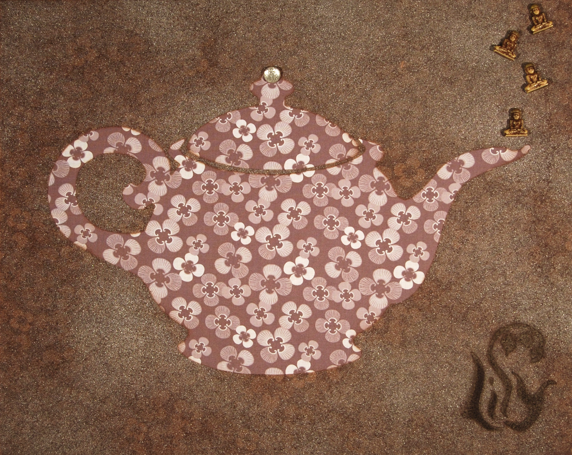Floating above the spout of this earthy teapot are vintage glass sitting Buddhas, opaque tan with a dark brown wash and a gold painted hat and base. Crystal clear vintage sugar stone glass stone tops the lid. The granular texture of this stone gives it an organic look and a soft glow.