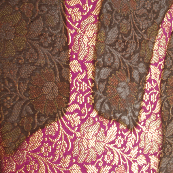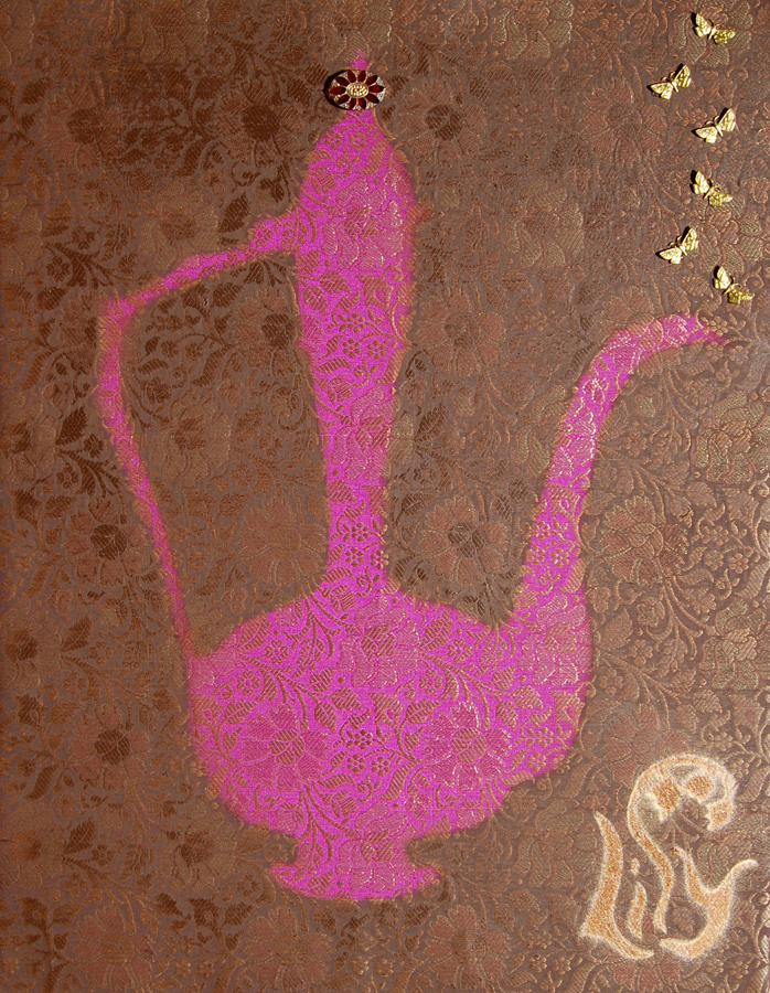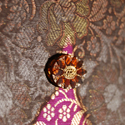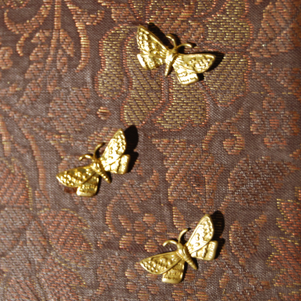 These splendid butterfly shape vintage metal findings come from a shop in Israel. A West German vintage glass topaz sunflower cabochon serves as a lid topper for this teapot of luscious Indian silk brocade fabric, patterned with a floral and leafy design in dull gold. Dimensions are 14" x 18".