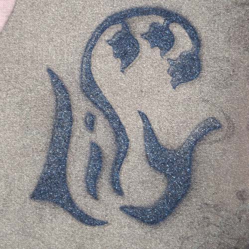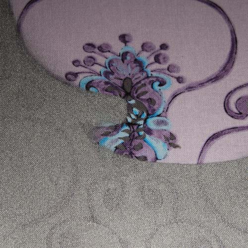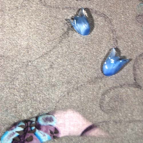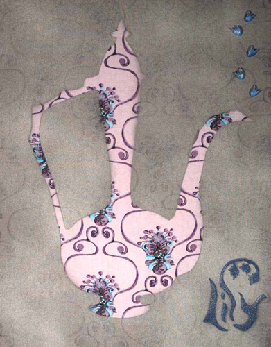 Antique tulip flower stones in baby blue moonstone glass float above the spout of this elegant teapot. Dimensions are 14" x 18".