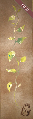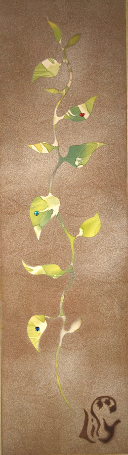 Tiny vintage glass bugs slowly explore the leaves of a climbing vine, made of exquisite Kimono silk fabric. The stones come from an old jeweler that closed down in the 50's and have been stored in a box ever since, until now.