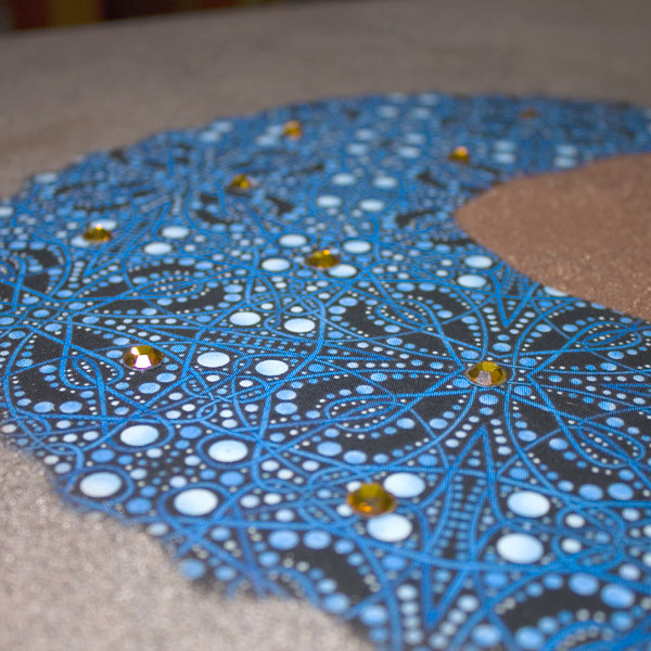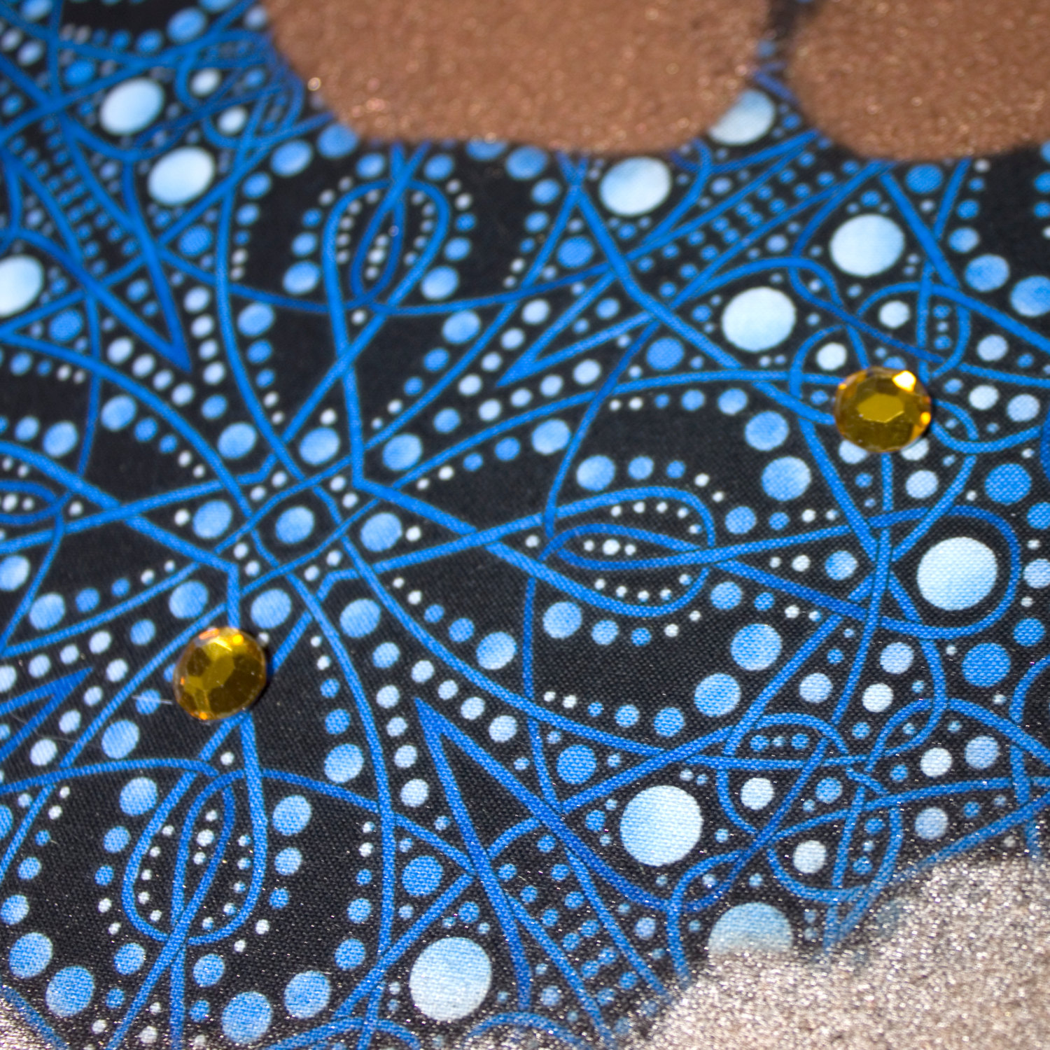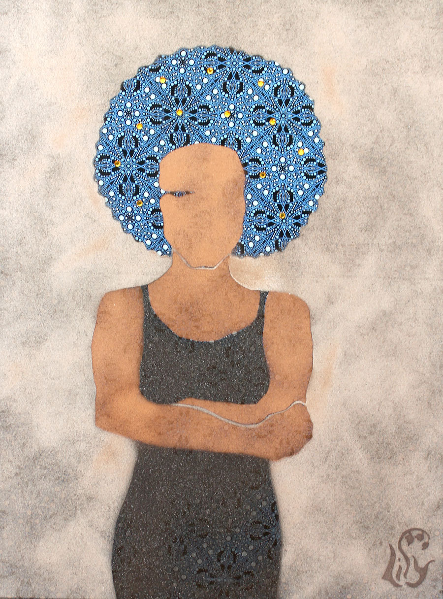 Her hair sparkles as the light shifts with highlights of Siam Swavorski crystal stones made in the late 60's/early 70's. Each subject is part of a limited edition. The colors, fabric pattern, and vintage accents vary with each piece.