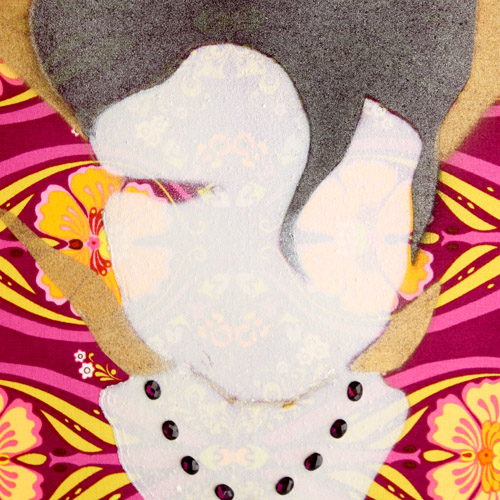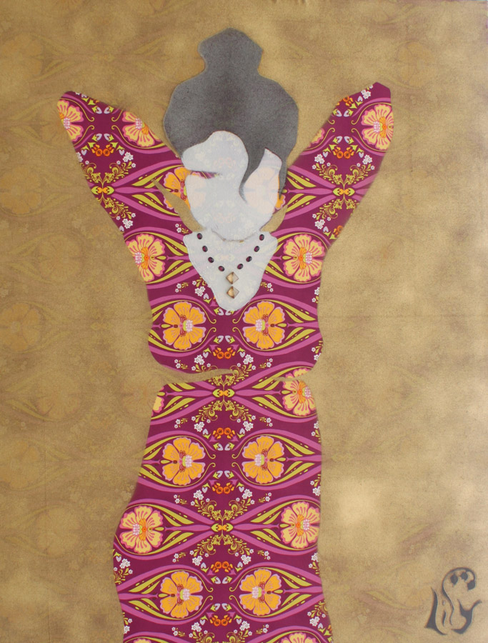 She fastens the clasp of a stunning necklace composed of a chain of amethyst faceted mirror glass with a smoky quartz pendant. The dimensions are 27" x 35".